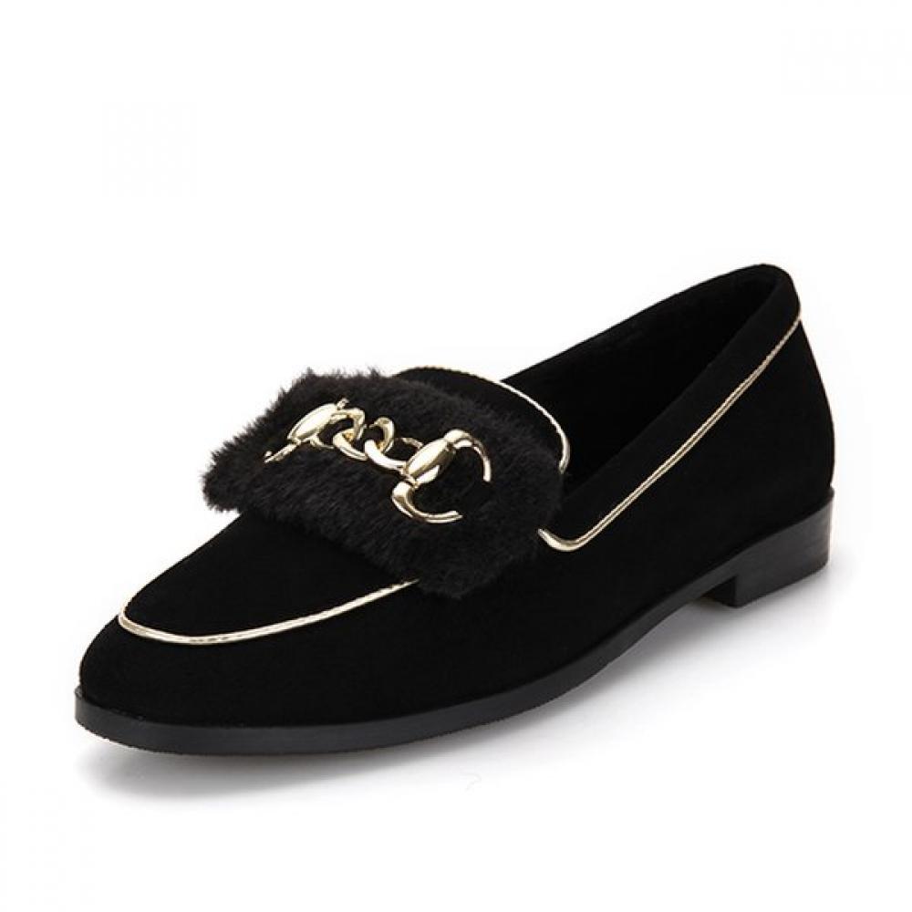 The BABARA Suede Fur Gold Decorated Loafer BBF554BK is a product that features a sophisticated black color and luxurious gold accents, providing comfort with its 2cm low heel. Made from suede and fur materials, it offers a soft and warm feel, making it suitable for various styles as a daily wear option.