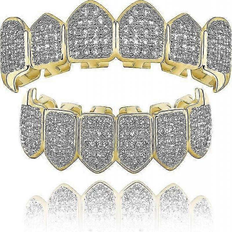 Diamond Grills for Your Teeth Women 18K Gold Plated Fully Iced Out CZ Vampire Top and Bottom Face Mouth Men with Extra Molding Bars Cosplay Costumegol