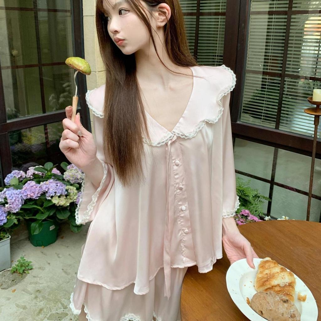 French premium long-sleeved ice silk pajamas women's summer new lace loungewear cardigan shorts skin-friendly set