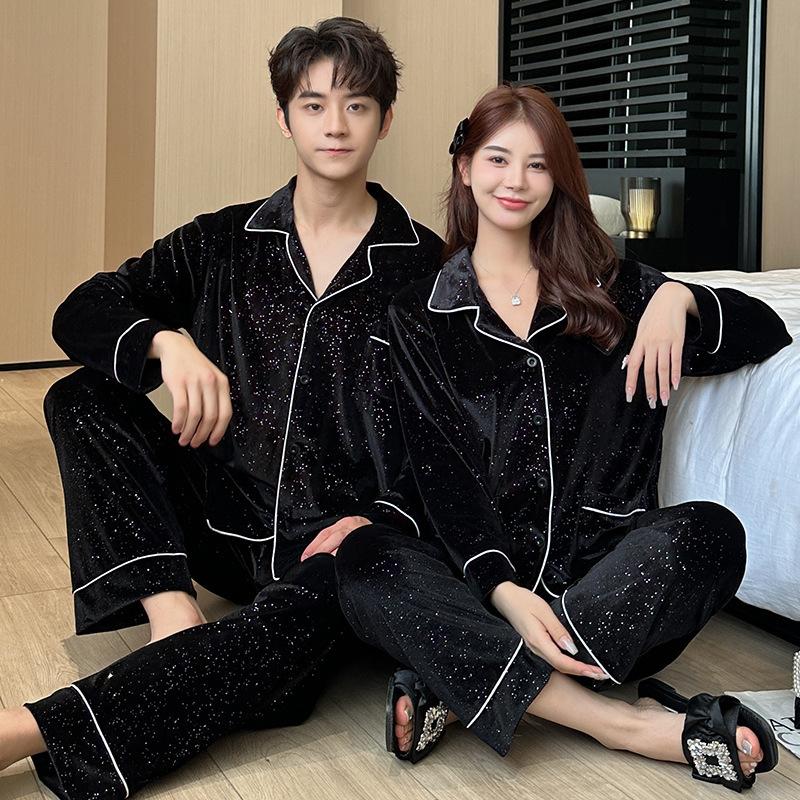 Golden velvet pajamas for women, couples, men's long-sleeved cardigan, premium new Korean version, popular loungewear can be worn outside