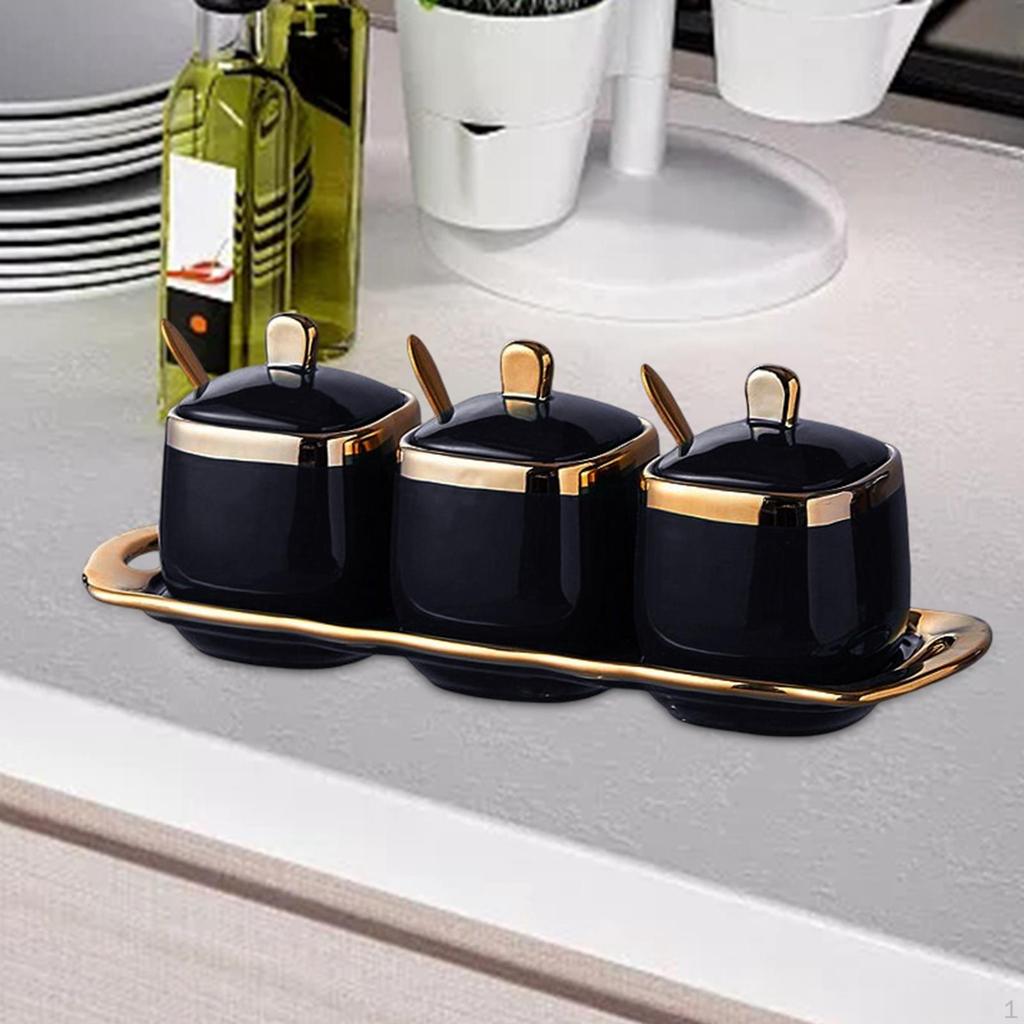 - Packaging Details: condiment canisters pots include 3 ceramic jars,3 spoons and lids, a tray.