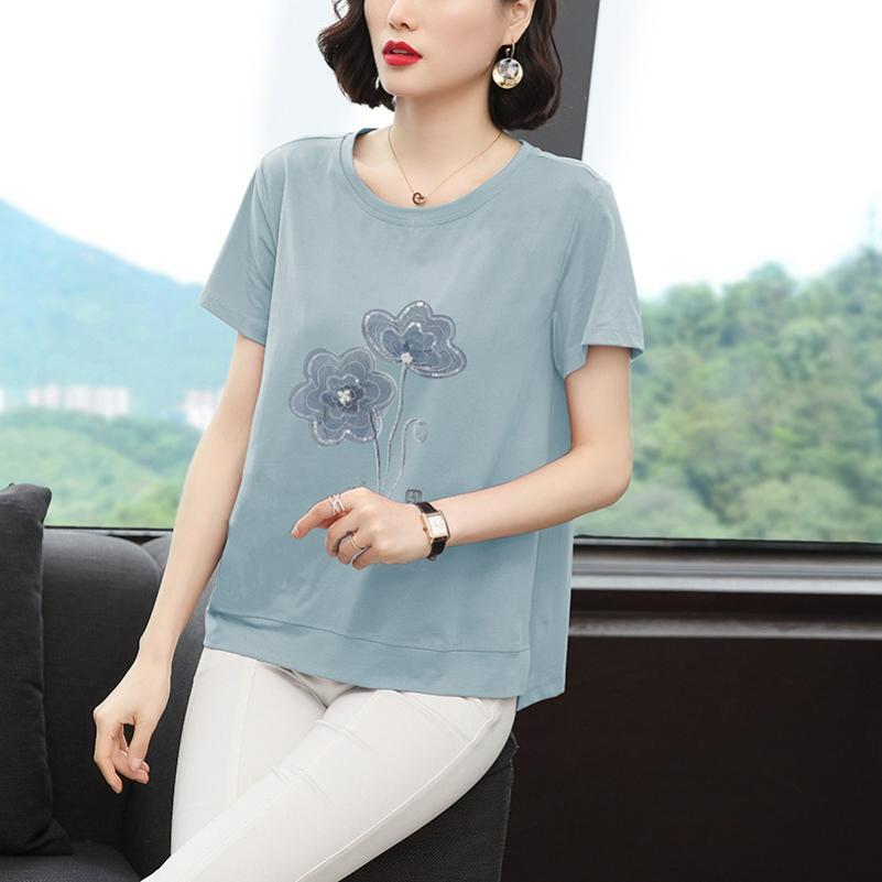 Round Neck Printed Short-sleeved T-shirt Women's Summer Pullover Plus Size Loose Mother Casual Top