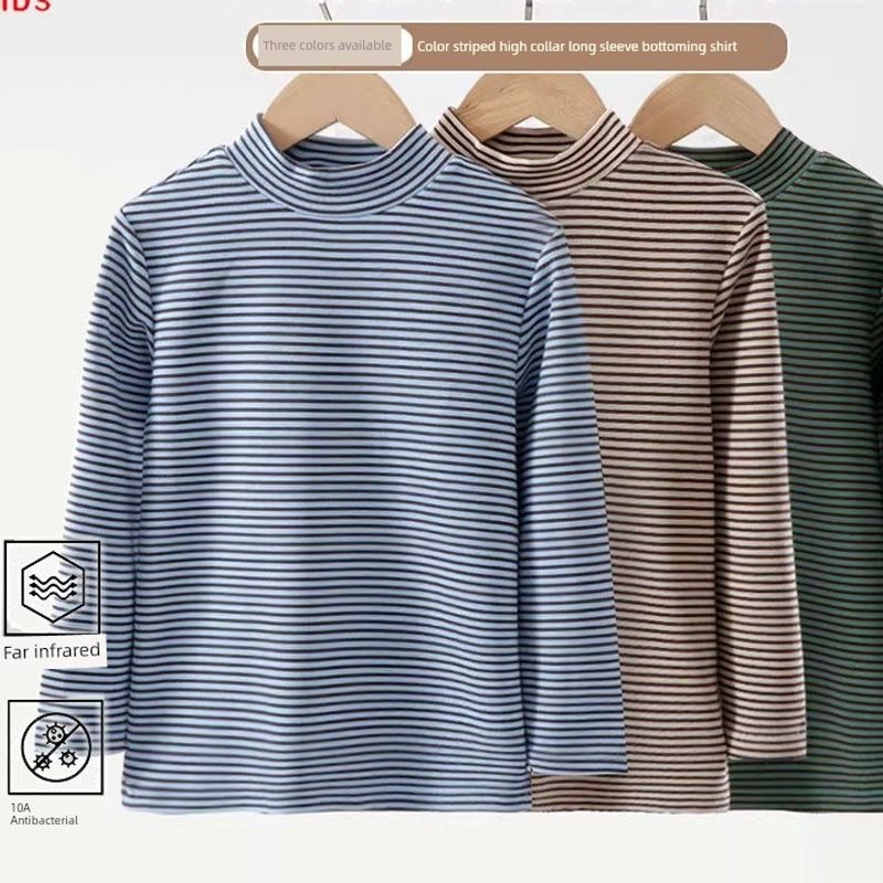 Half-Turtleneck Base Layer Shirt, Long-Sleeved T-Shirt for Boys and Girls, Striped Warm Top for Older Children, Autumn and Winter Children's Clothing