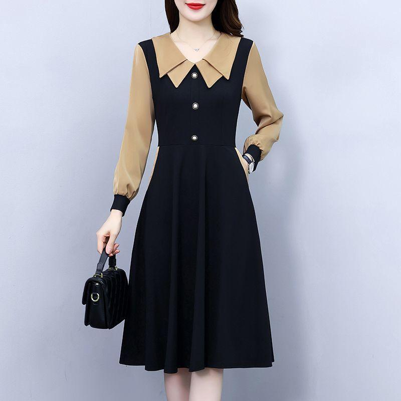 Women's Korean-Style Casual Slimming Elegant A-Line Dress Zipper Patchwork Button Fake Two-Piece Long-Sleeve Dress
