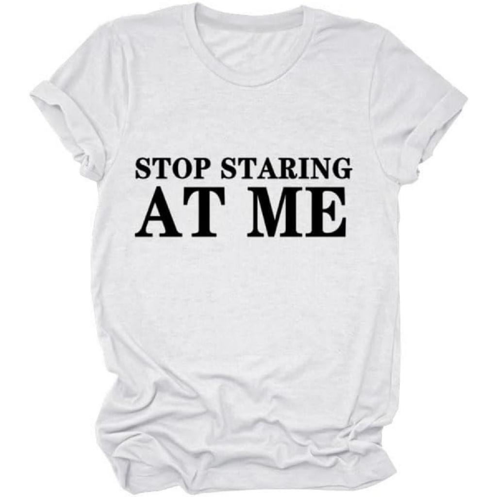 GAQEUWR Womens O-Neck Shirt, Stop Staring at Me Shirt, Casual Sarcastic Humor Graphic Letter Print Short Sleeve Tee Tops