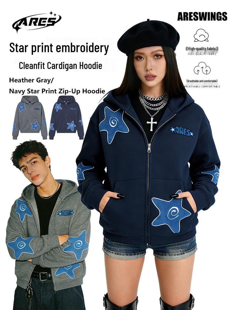 Experience comfort and style with this heavyweight fleece-lined men's cardigan hoodie, perfect for the spring season. Designed with a round neckline and long sleeves, it features an eye-catching swirl star pattern and is adorned with intricate embroidery. Made from high-quality cotton material, both the hoodie and its fur lining ensure warmth and softness. Its loose fit provides a relaxed and comfortable wear, making it an ideal choice for casual outings or cozy days at home.