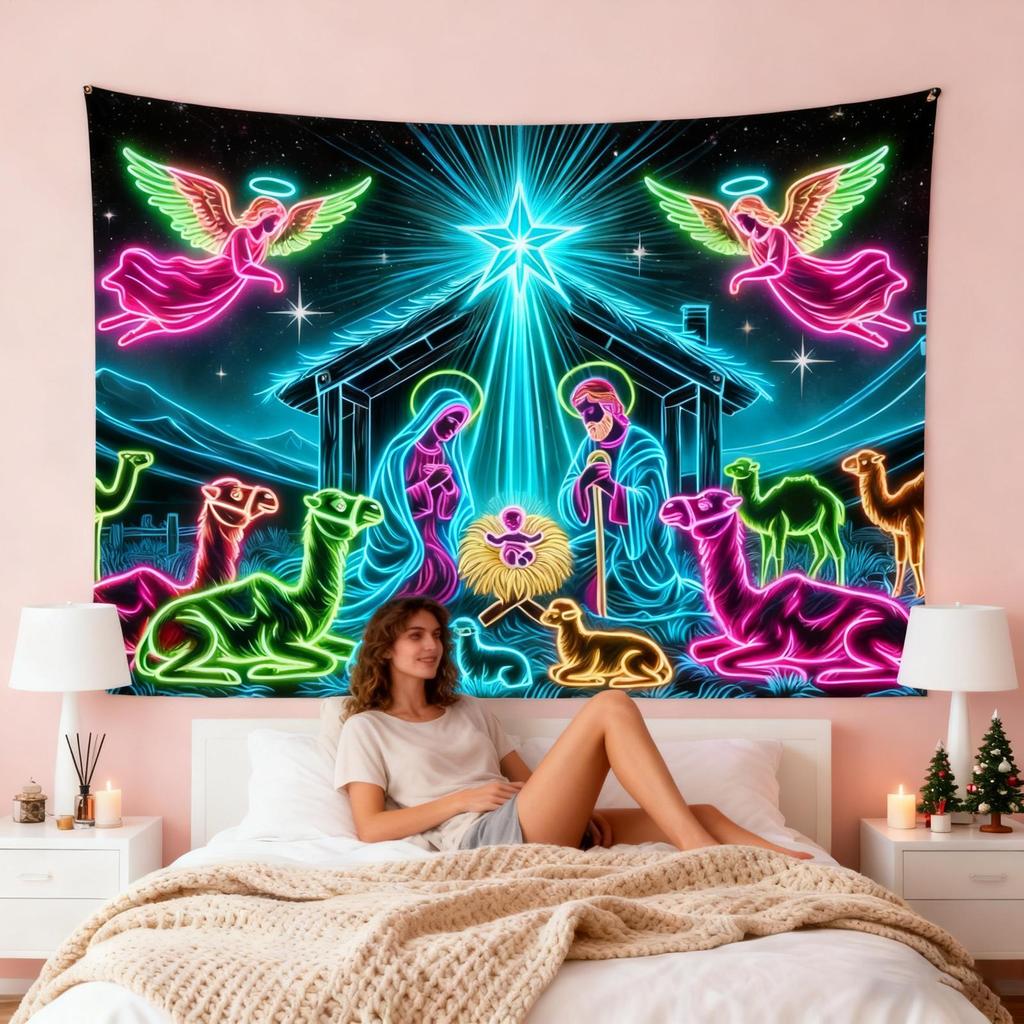 Nativity Tapestry Wall 6x7.5ft UV-Reactive Christmas Festive Decoration Glow In The Dark Festive Backdrop For College Students
