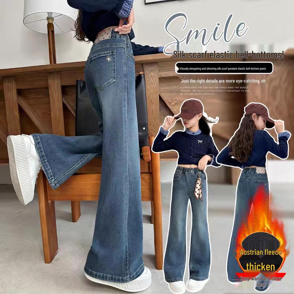 Introduce a stylish and comfortable addition to your child's winter wardrobe with these thickened casual pants. Designed for big kids, these plus velvet flare jeans offer both warmth and fashion for the chilly autumn and winter months. Crafted from high-quality cotton, they provide a soft and cozy feel against the skin. The flare design adds a trendy touch, making them perfect for pairing with a variety of tops. These jeans are ideal for keeping your little one both warm and chic throughout the colder seasons.