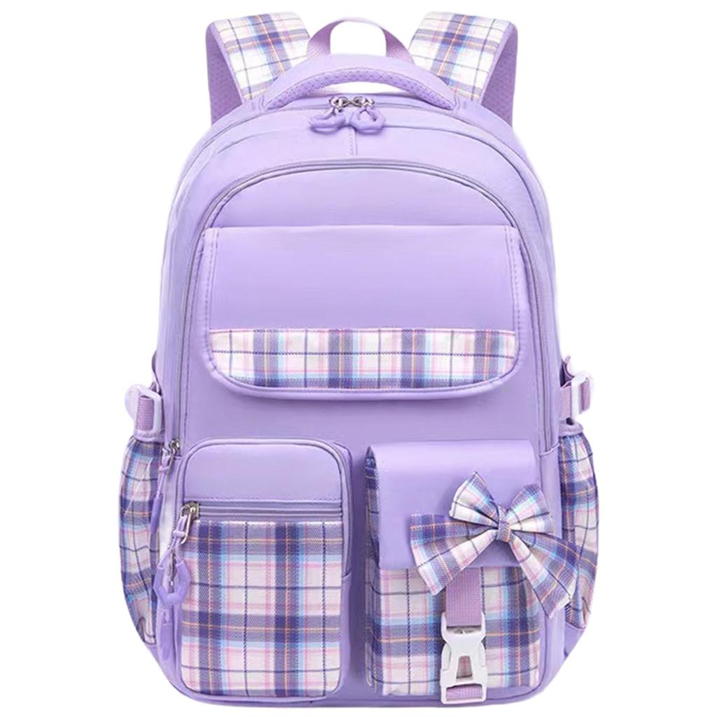 Mygreen Checkered Backpack with Pockets and Cute Perfect for Elementary School School and Travel Multi-Purpose Ribbon, Students, Trips, (Purple)