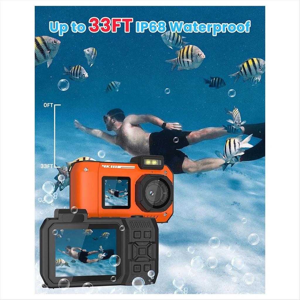Waterproof Camera 4K 65MP Underwater Camera with 64G Card, for Snorkeling Autofocus Selfie Dual-Screen Orange