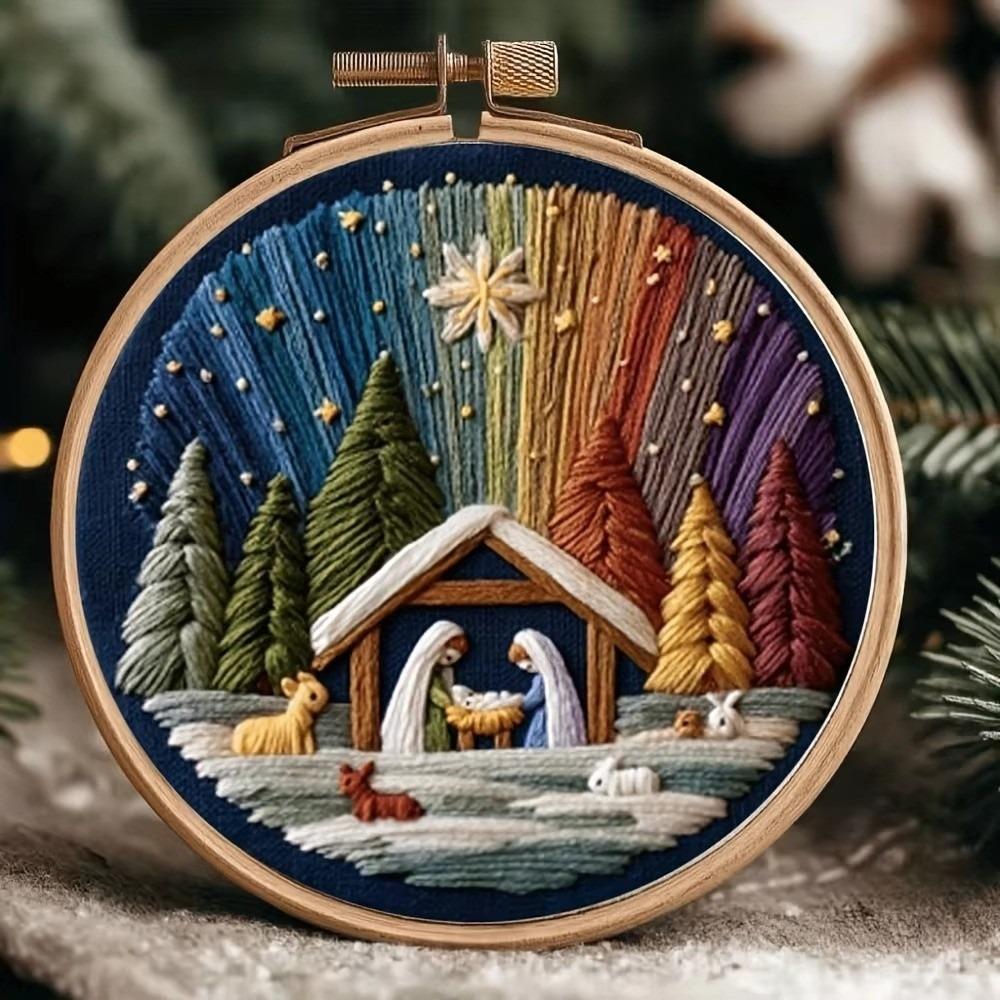 DIY Material Nativity Embroidery Set Pre-printed Pattern on Cloth with EN Instructions, Thread Christmas Embroidery Kit