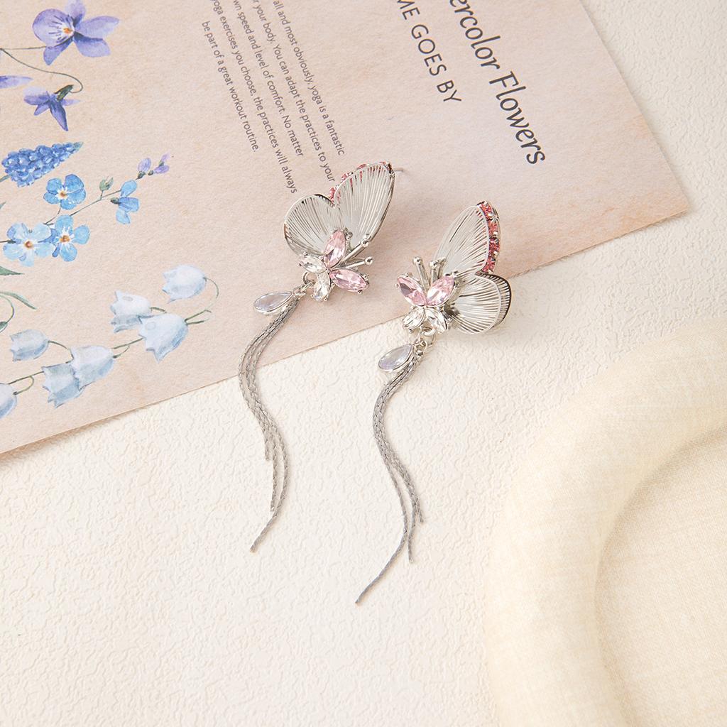 Silver needle super fairy tassel shining pink three-dimensional butterfly stud earrings heavy industry light luxury high sense unique niche earrings