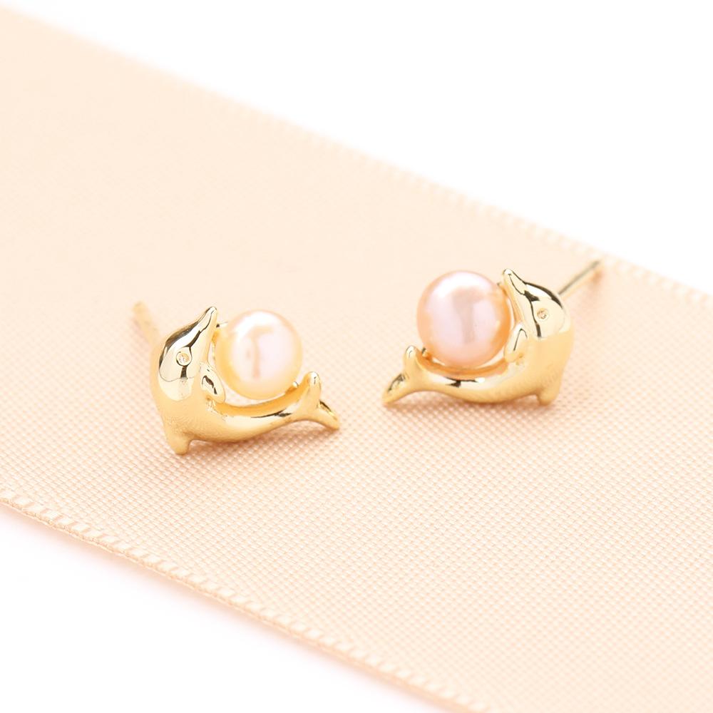 New cute simple gold-plated dolphin earrings, small and versatile natural freshwater pearl 925 silver needle stud earrings for women