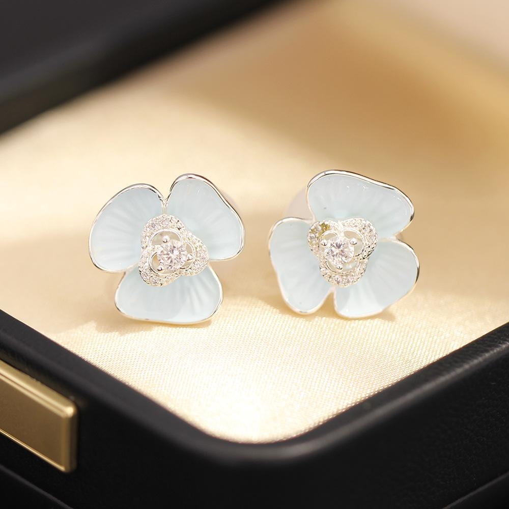 Korean sweet blue and white oil-dripping petal earrings temperament diamond-set exquisite flowers without ear piercings earrings women's models