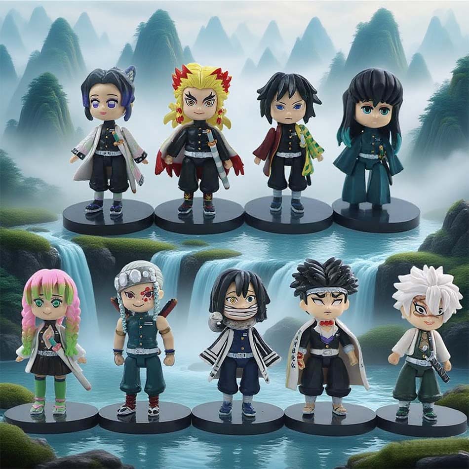 9Pcs/Set Demon Slayer Q Version Sitting Figure Toy Anime Kimetsu no Yaiba Tanjiro Nidouzi Inosuke Zenizu PVD Figurine Model Doll