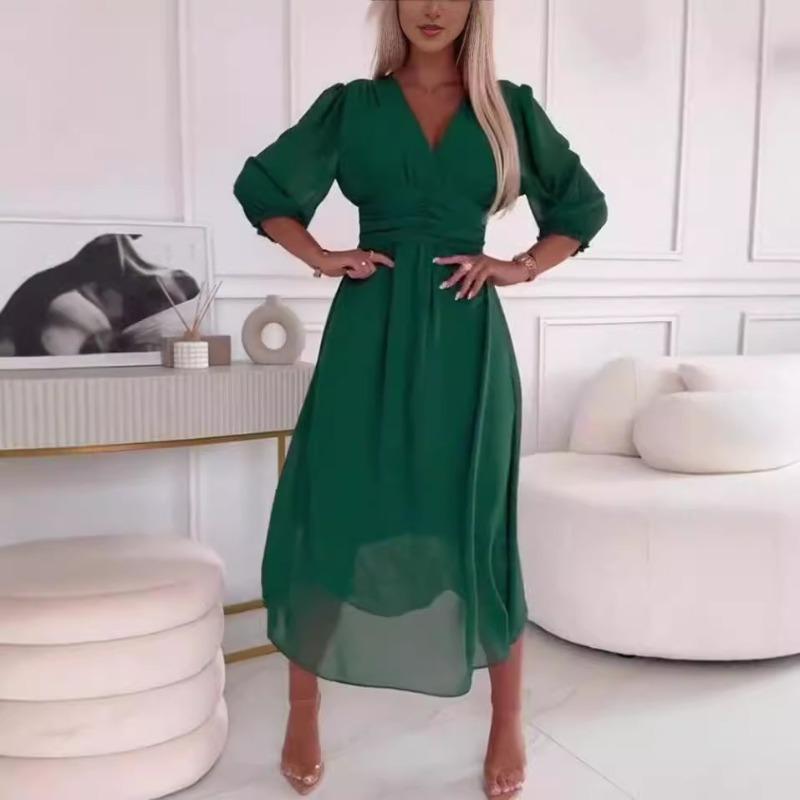 Women's Fashion Summer Spring Solid Color Print 3/4 Sleeve V-Neck Casual Dresses