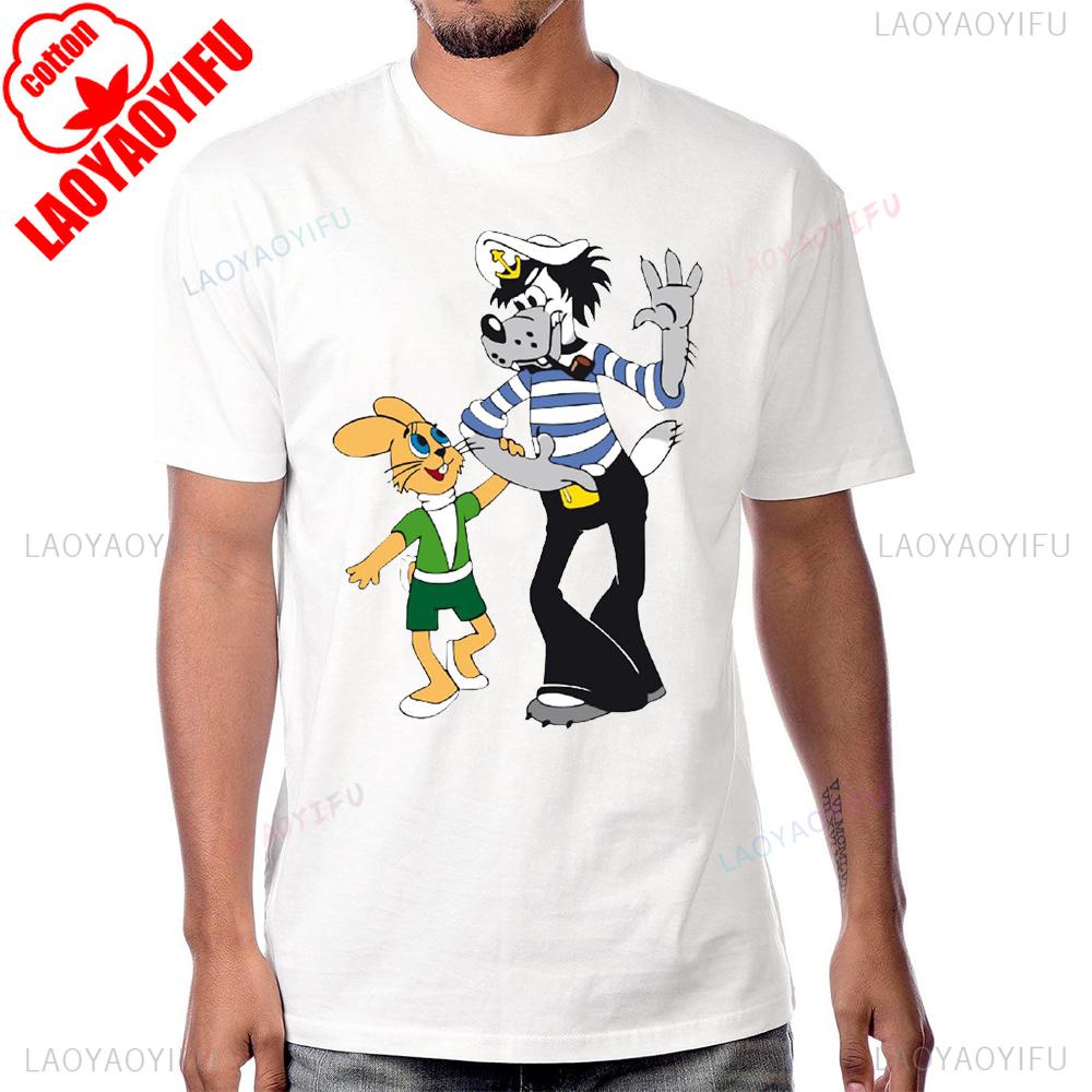 Wolf and Rabbit Nu Pogodi Cartoon Graphic Animation Tshirt Casual Fashion Loose Short Sleeve Cotton Tshirt Summer Man T Shirt