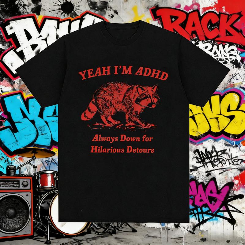 2025 Summer Funny Yeah I'm ADHD Raccoon Meme T Shirts Men Women Fashion Casual O-Neck Oversized 100% Pure Cotton Printed T-shirt