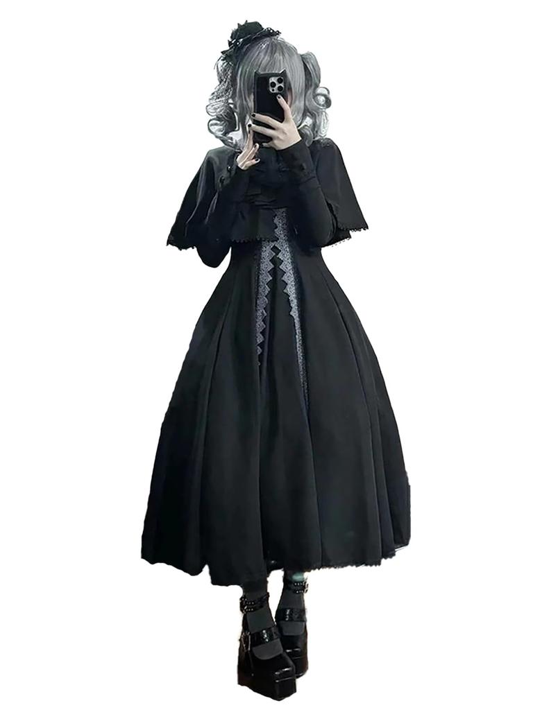 MODKOKU Gothic Lolita Dress with Ribbon and Lace Gothic Lolita Girly Long XL Cape-Style Dress, Women's Waistband, Ruffles, Long, Dress, Dreamy, Cute,