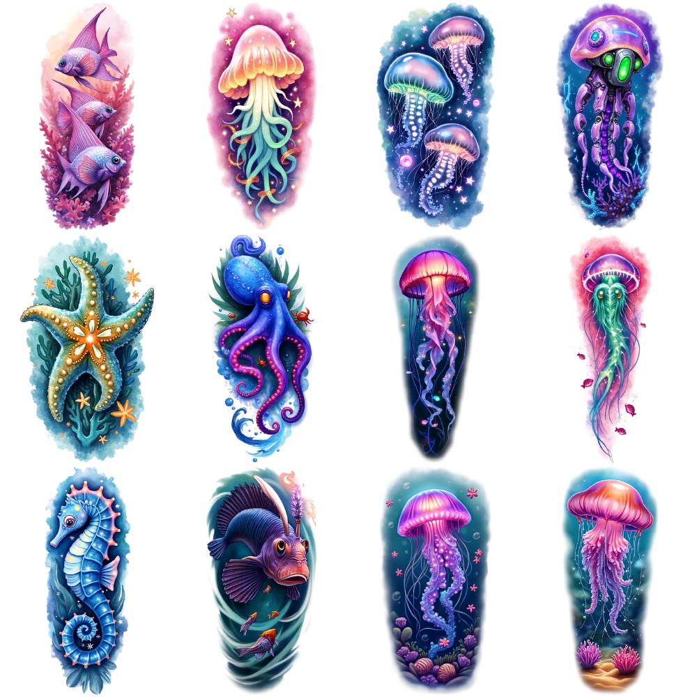 12pcs Temporary Tattoo Colorful Realism Octopus Robot Jellyfish Seahorse For Back Men Women