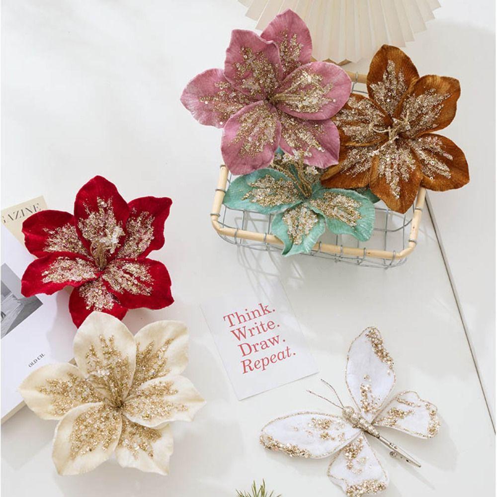 19cm Artificial Poinsettia Glitter Flower Glitter Sequin Fake Christmas Flowers Simulation Flannel 3D Simulation Flower