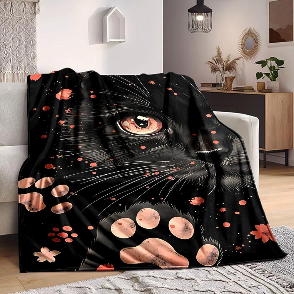 1pc Black Cat Print Blanket, Lightweight Flannel Throw For Sofa, Bed, Travel, Camping, Livingroom, Office, Couch, Chair