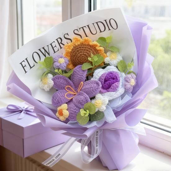 This handcrafted crochet bouquet features high-quality wool and simulated green leaves, ensuring long-lasting beauty without wilting or deformation. Perfect as an eco-friendly alternative to fresh flowers, it makes a thoughtful gift for anniversaries, birthdays, or graduations. The harmonious color palette combines soft purples with white, yellow, orange, and green accents, creating a warm and romantic visual appeal.