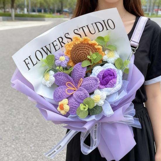 This handcrafted crochet bouquet features high-quality wool and simulated green leaves, ensuring long-lasting beauty without wilting or deformation. Perfect as an eco-friendly alternative to fresh flowers, it makes a thoughtful gift for anniversaries, birthdays, or graduations. The harmonious color palette combines soft purples with white, yellow, orange, and green accents, creating a warm and romantic visual appeal.