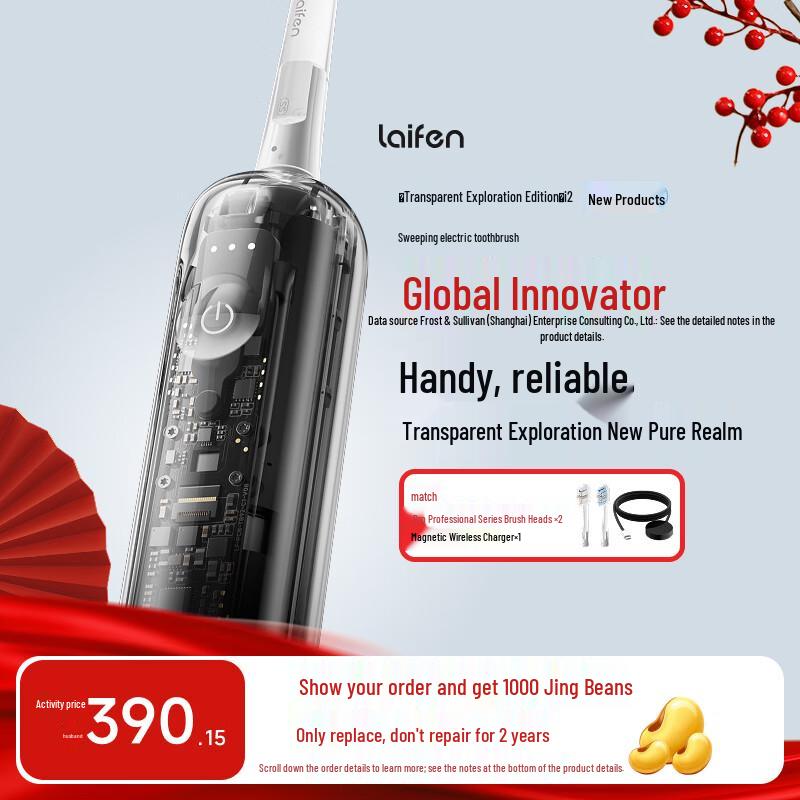 The Laifen i2 Smart Sonic Electric Toothbrush brings advanced oral care to adults. This second-generation model features a unique transparent exploration design, offering deep cleaning and gum care. With AI intelligent functions, Bluetooth connectivity, and a pressure sensor, it ensures an optimized brushing experience. It boasts an IPX8 waterproof rating, magnetic charging, soft bristles, and multiple cleaning modes including sensitive and smart cleaning. CN plug (adapter included)