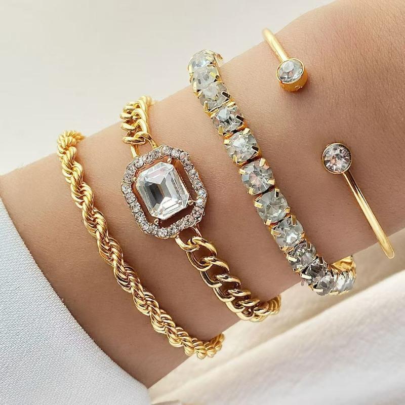 Literary and Artistic Retro Versatile Metal Chain Square Diamond 4-piece Set of Hot Selling Multi-layer Diamond Stacked Bracelet Set