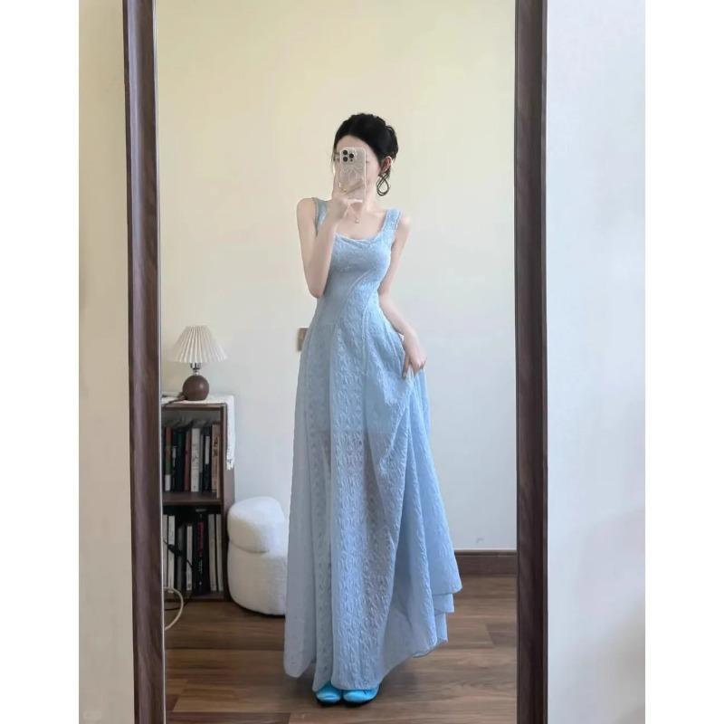 Women's Elegant Light Blue Maxi Spaghetti Strap A-Line Evening Party Dress