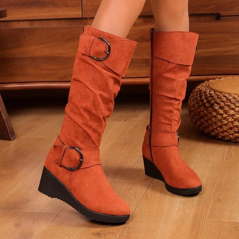 2025 New Fashion Wedge Single Boots Autumn New Round Toe Metal Belt Buckle Platform Anti-Slip Wear-Resistant Tall Boots