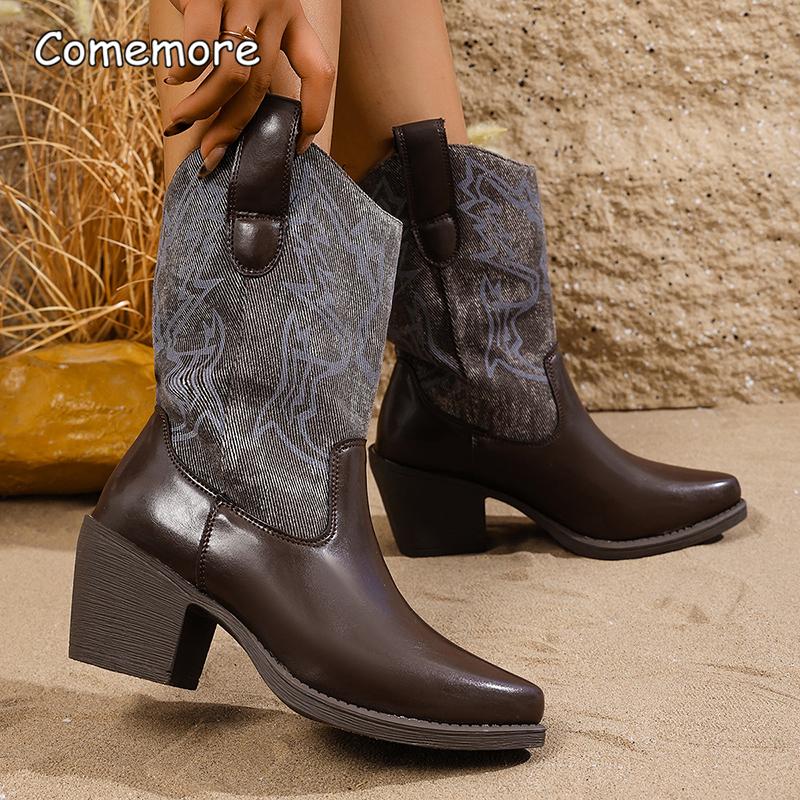 Retro Embroidered Women's Cowboy Boots Chunky High Heels Pointed Toe Autumn Boots Woman Brown PU Leather Western Botas De Mujer