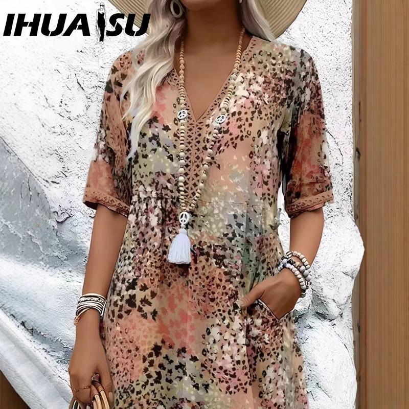 IHUASU Kadın Modası Yaz İlkbahar Kısa Kollu V Yaka Günlük Elbiseler
