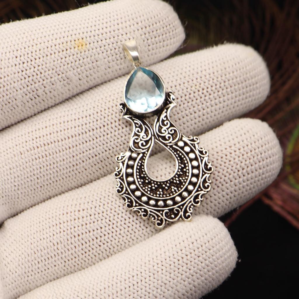 Sky Blue Topaz Gemstone 925 Sterling Silver Jewelry Women Oxidize Pendant 1.8" For Mother's Day Gift CP-45-9
