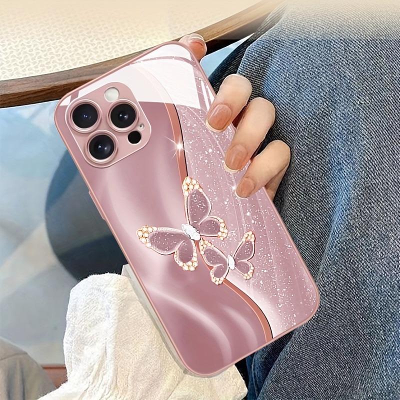 Diamond Butterfly Pattern Pink Metallic Paint Glass Hard Phone Case For iPhone 17 Pro Max 11 12 13 14 15 16 Plus 16E 17Air Cover