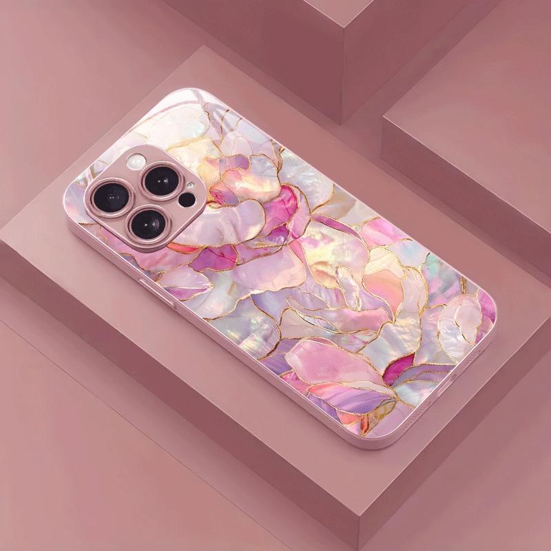 Creative Pink Crystal Floral Charm Metallic Glass Phone Case For iPhone 17 16 15 14 13 12 11 Pro Max 15 14 Plus 17 Air 16E Cover