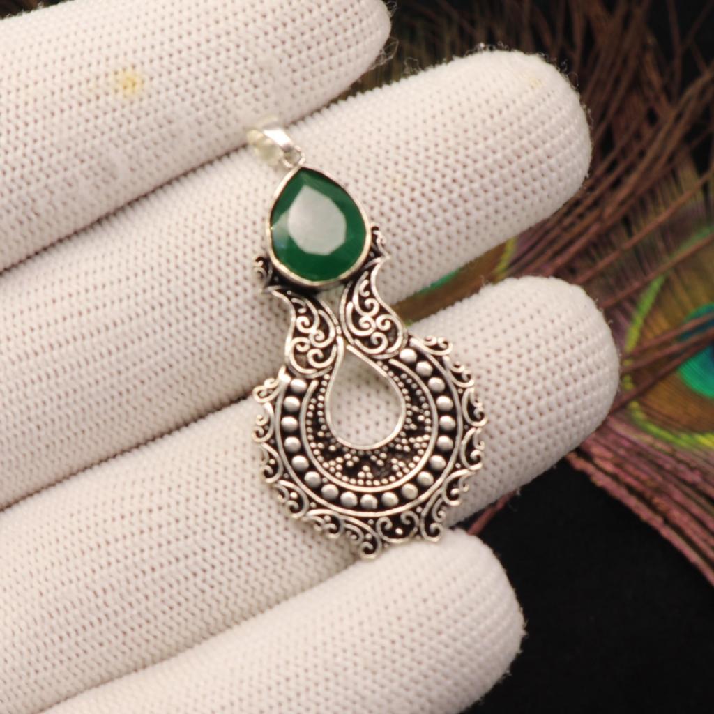 Green Onyx Gemstone 925 Sterling Silver Women Jewelry Partywear Chain Pendant 1.8" For Wife