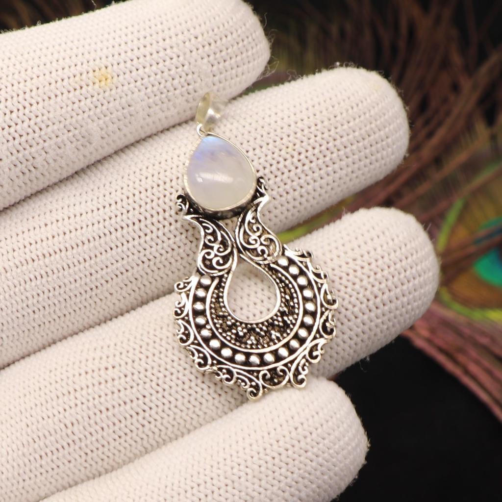 Natural Rainbow Moonstone Gemstone 925 Sterling Silver Oxidize Jewelry Pretty White-Stone Pendant 1.8" For Your Loved Ones CP-45-22