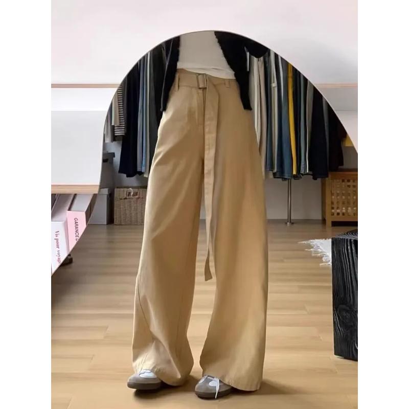 Women's Khaki Tie-waist Wide Leg Pants High Waist Loose-fit Casual Trousers