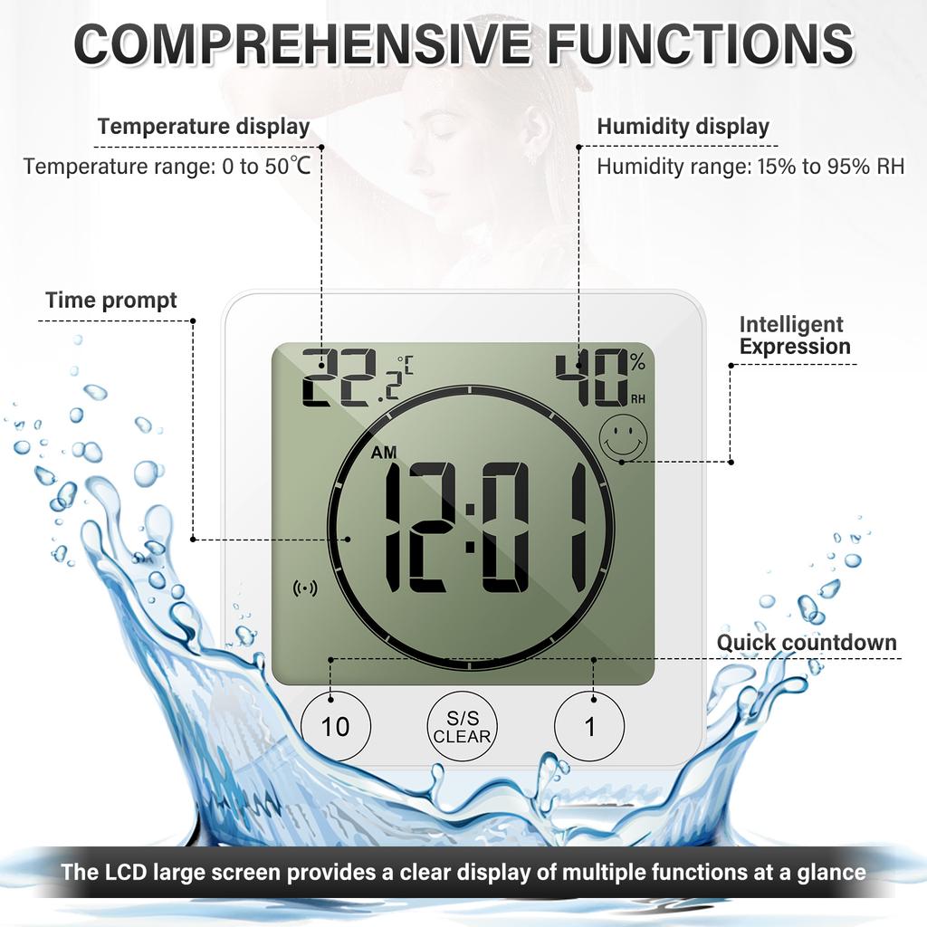 【IP25 Waterproof Design】The body of the bathroom clock is constructed of quality ABS with IP25 waterproof design , which can effectively block water splashing , and is not easy to be damaged even when used in a wet bathroom environment , and is specially designed for bathroom scenarios , water drain timer , shower reminder are reliable