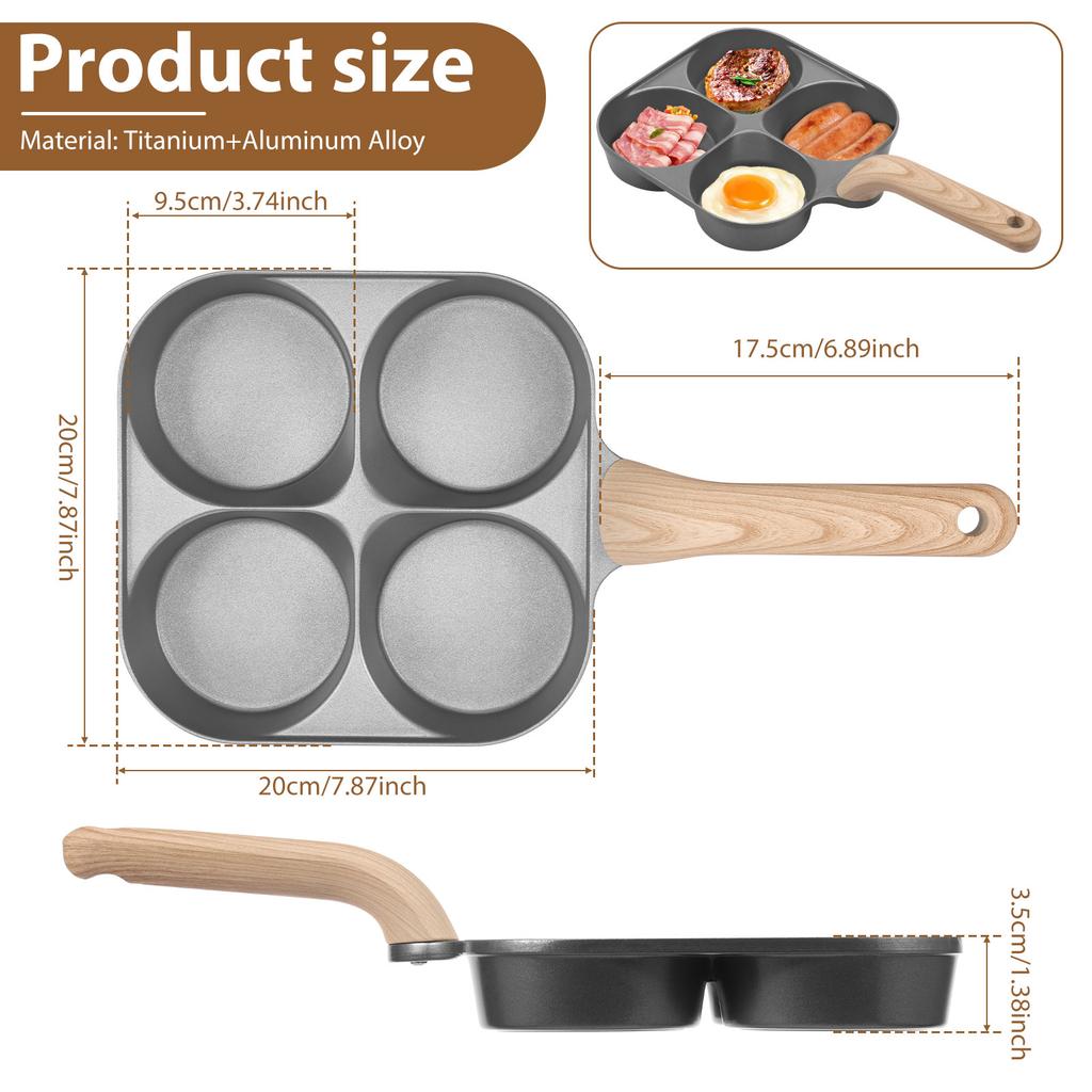 【4 in 1 Multi Function Design】Fried Egg Pan is a versatile kitchen workhorse , use it as an egg fryer , pancake pan , or egg burger maker to nail all your breakfast and snack needs . The 4 compartment layout lets you cook 4 eggs at once , or whip up pancakes , egg muffins , cheese sandwiches , burgers , sausages , or bacon simultaneously . No more juggling multiple pans for a full meal