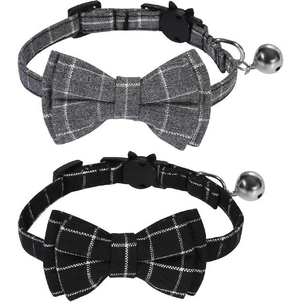 SLSON 2 Pack Breakaway Cat Collar with Bell and Bow Tie Plaid Kitten Collar for Cats and Small Dogs Pets Adjustable from 8-11In, Black and Grey