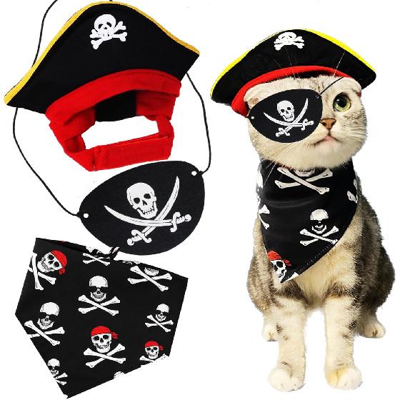 Cat Pirate Costume - Pet Hat, Skull Triangle Bandana, Halloween for Dogs Cats With Captain Headwear and Party Necklace