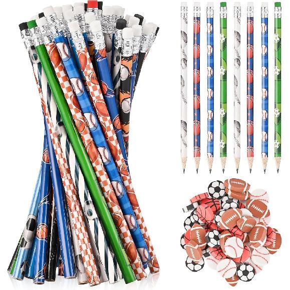 Goldge 48 Sports Pencils for Kids and 48 Pcs Erasers, Baseball Soccer Basketball Pencils #2, Fun Pencils Erasers, Birthday Pencils, School Office
