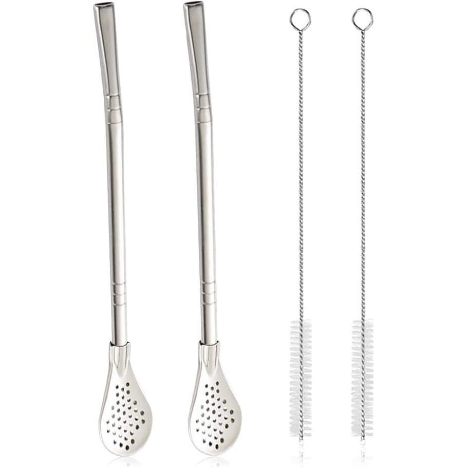 2Pcs Removable Stainless Steel Straw Filter Spoon with 2 Cleaning Brush, Reble Metal Straw Spoon Cocktail Stirrer for Drinking Loose Tea, Ice Coffee,