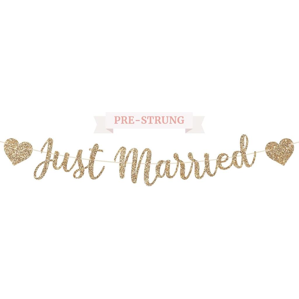 Pre-strung Just Married Banner - No DIY - Gold Glitter Wedding Party Banner in Script - Pre-strung Garland on 6 ft Strand - Gold Wedding Reception