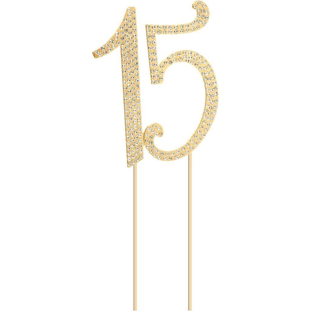 Honbay 15 Birthday Cake Topper Sparkly Bling Alloy Crystal Rhinestones Cake Topper Cake Decoration for 15th Birthday or Anniversary Party (Gold)