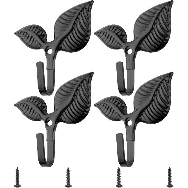 Set of 4 Vintage Leaf Wall Hooks Black Metal Coat Hooks Heavy Duty Decorative Iron Hook Wall Mounted Hangers for Hanging Towels Coats Hats Scarf Bags