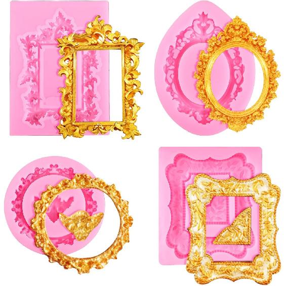 4 Pcs Photo Frame Silicone Molds, Baroque Style Air Dry Clay Molds, Mini Frame Molds Silicone for Cupcake Topper Cake Decoration Chocolate Candy